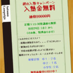 通常入塾金20000円のところ、無料で入塾が可能です。 その他、特典がありますので気軽にお問い合わせください。 無料体験も随時受け付け中です - 2025年度夏期講習の受付を開始しました新講座として、速読解講座を夏期講習より開始します また、中学生には夏休み明けの定期テストまでサポート込みのプランを、先着3名限定で用意しました お問い合わせや申込みはこちらのページから または03−6770−6936へお […]